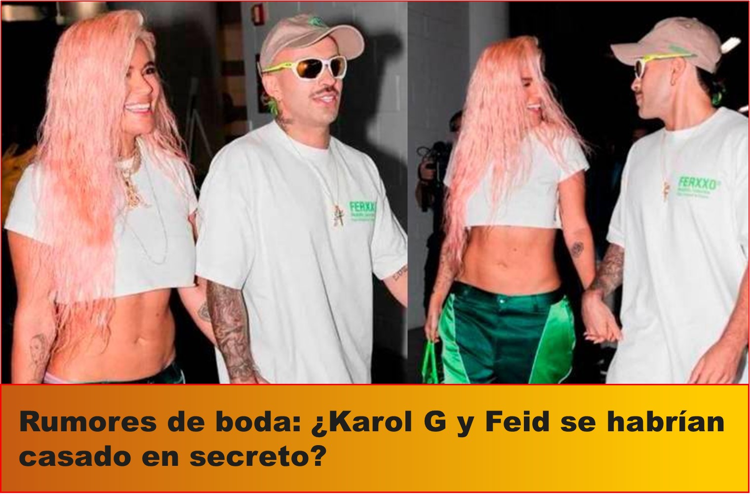 Recientemente en redes sociales ha comenzado a circular el rumor de que los artistas paisas contrajeron matrimonio. Todo comenzó por una fotografía en la que aparece alguien utilizando una camiseta con una foto estampada en la que aparecen Karol G y Feid juntos. Ambos están vestidos de blanco y ella lleva una corona de flores, lo cual ha sido interpretado como un símbolo de una ceremonia.